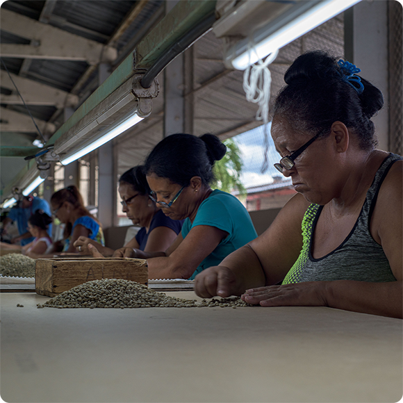 Seleccionar y clasificar distintos tipos de café puede mejorar su valor global y su calidad en taza. Esta tarea se lleva a cabo utilizando cribas de café (para separar los granos por tamaños) y una máquina clasificadora (para eliminar los defectos más importantes). La Fundación Lavazza ha puesto en marcha un sistema final de clasificación manual, realizado y gestionado por un equipo de 95 mujeres. Gracias a este último paso, ahora es posible clasificar el café por calidad y eliminar los defectos que no se han podido identificar mecánicamente.